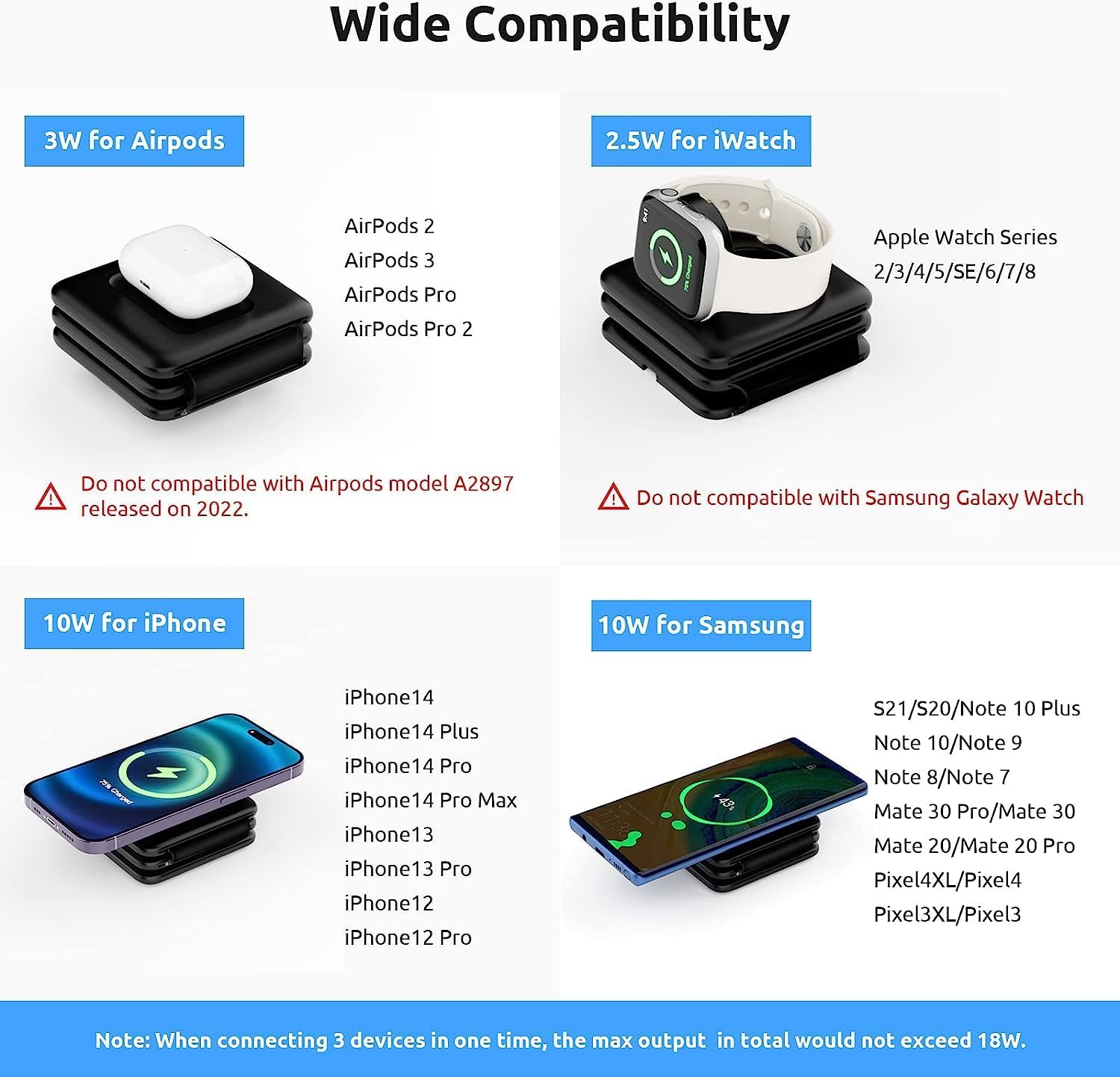 Built with fast wireless charging technology, this charger delivers stable and efficient power while protecting your devices from over-charging, overheating, and short circuits. The dedicated charging spots ensure perfect alignment for reliable charging every time.